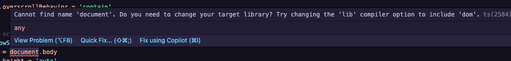 Cannot find name 'document'. Do you need to change your target library? Try changing the 'lib' compiler option to include 'dom'.ts(2584) # ![code error]
